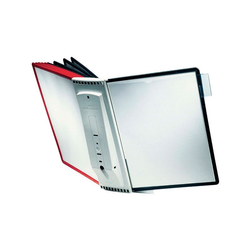 Clasificador de pared con 10 fundas, tamaño A4 (5 rojas y 5 negras o 5 grises y 5 negras). Incluye caballetes con etiquetas en blanco intercambiables. Ampliable. Colores variados.